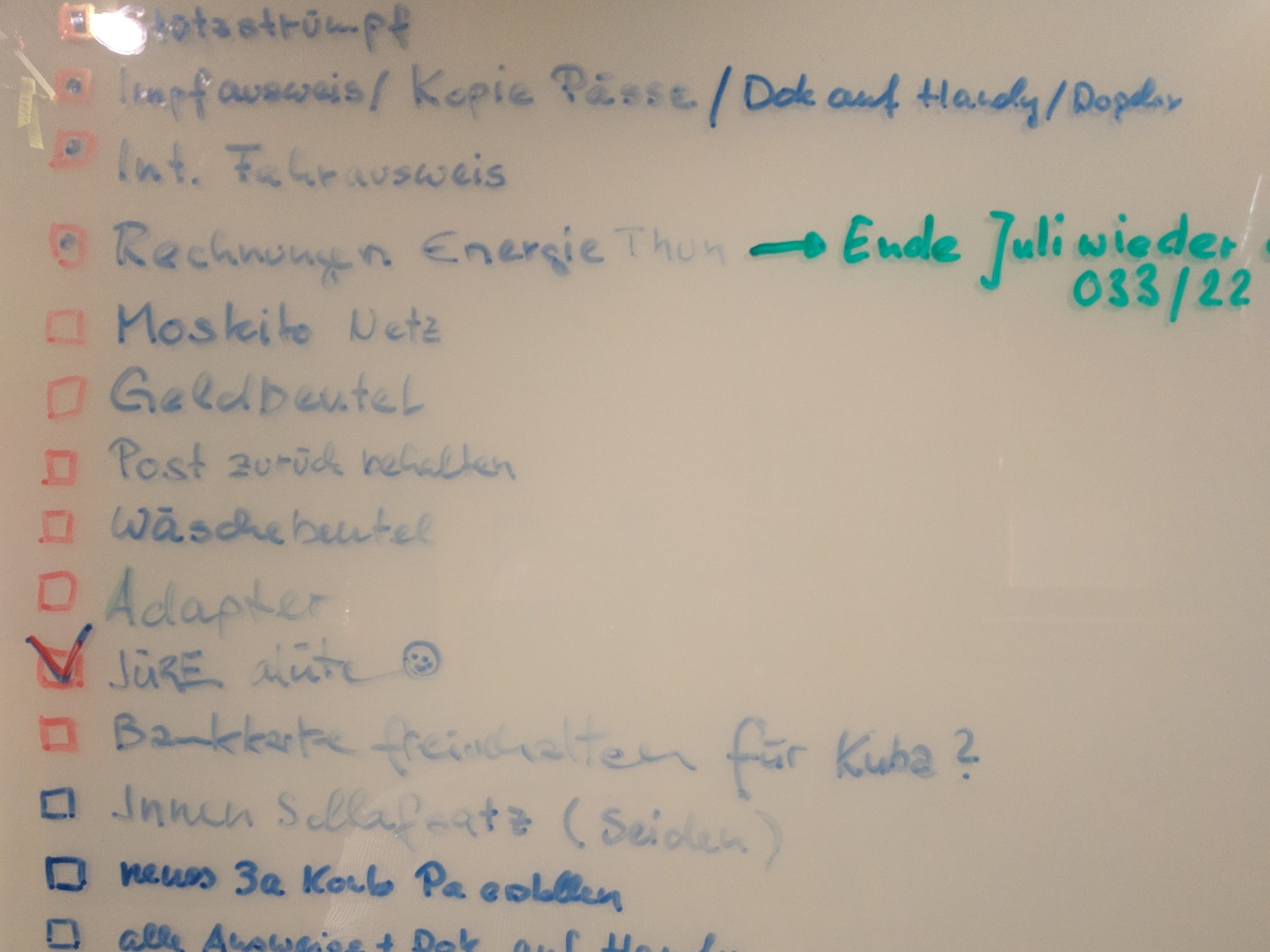Die Zeit vergeht im Flug und irgendwie immer noch nicht so richtig mit Reisevorbereitung angefangen. Und doch gibt es schon ein paar Sächeli, die erledigt werden könnten.