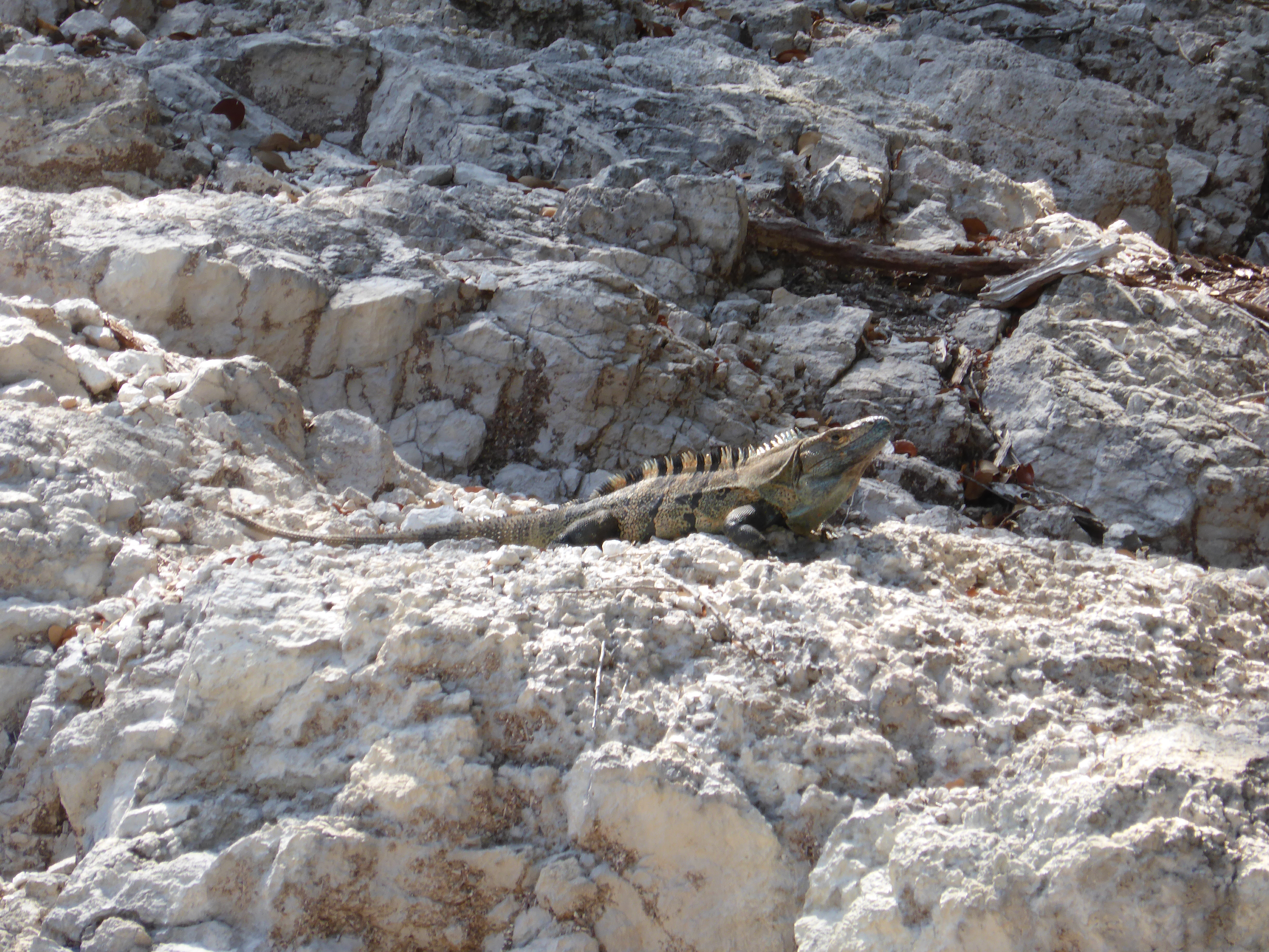Tja und irgendwann habe ich, in vermeindlich sicherer Distanz diese Riesenechse auf einem Felsen, ein Sonnenbad nehmend, entdeckt. Rasch Kamera ausgepackt und mit dem optischen Zoom die Sache etwas in die Nähe gerückt und geknips. Nach dieser Bildtrophäe habe ich mich dann in den Schatten gesetzt und mich meienem Sandwitch gewidmet.