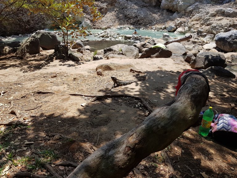 Wenige Eindrücke von Land und Natur. In den ersten Tagen dachte ich wo sind denn da die Tiere? Die Bäume sind so hoch, ich schaute zu wenig nach oben. Die Krichtiere hatte ich schon schneller im Visier. Wie auf einer Wanderung der Leguan, der sich plötzlich zu unserem Picknickplatz näherte.