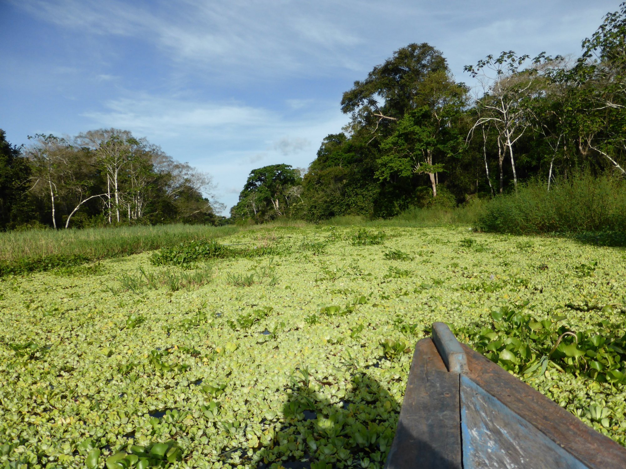 Am zweiten Tag fahren wir dann mit dem Boot den Seitenfluss weiter hoch und queren dann stundenlang dann überfluteten Dschungel, bis wir irgendwann den Rio Javari, auch ein Zufluss des Amazonas erreichen. Bei dieser Durchquerung blieben das Boot mehrfach im Dickicht stecken oder muss Umwege fahren, weil alles mit Holz verblockt ist. Diese Fahrt ist wunderschön. In der Zacambu Rainforest Lodge steigen wir dann ab.